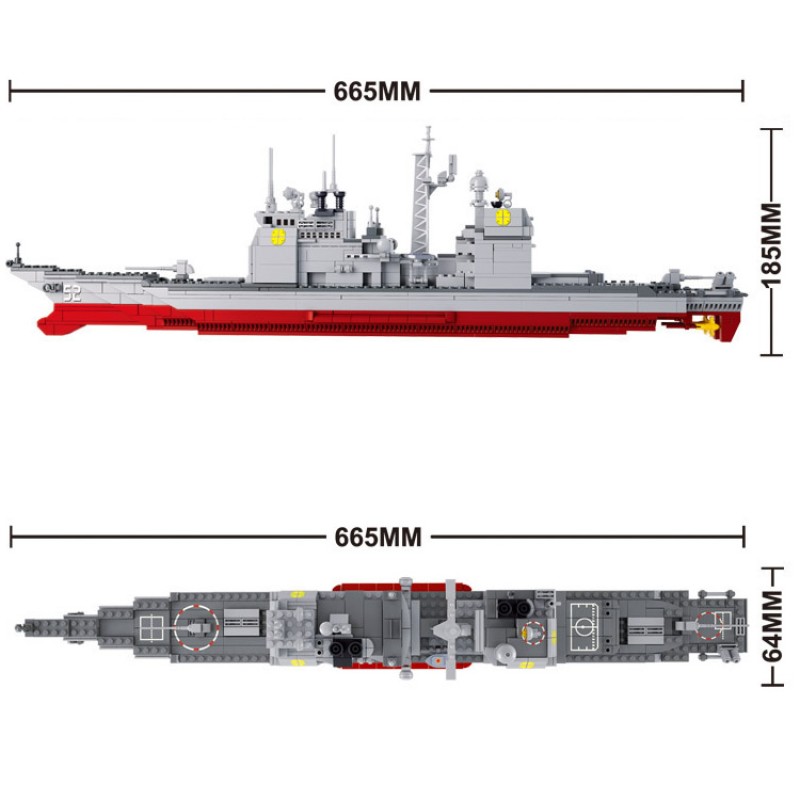 This set contains 883 building bricks which can be assembled into a 1:350 scale model of a Navy Cruiser.
