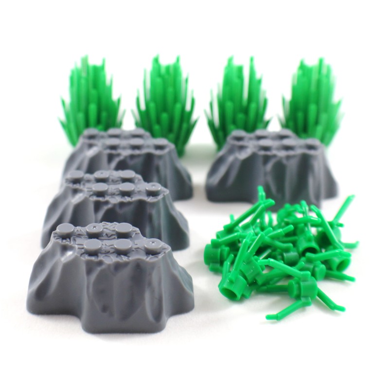 This scenery pack consists of 4 custom rock formations along with 4 bushes and several grass stems. The rocks have a 4x6 stud footprint and make for a unique feature to add to your own building block landscaping projects.