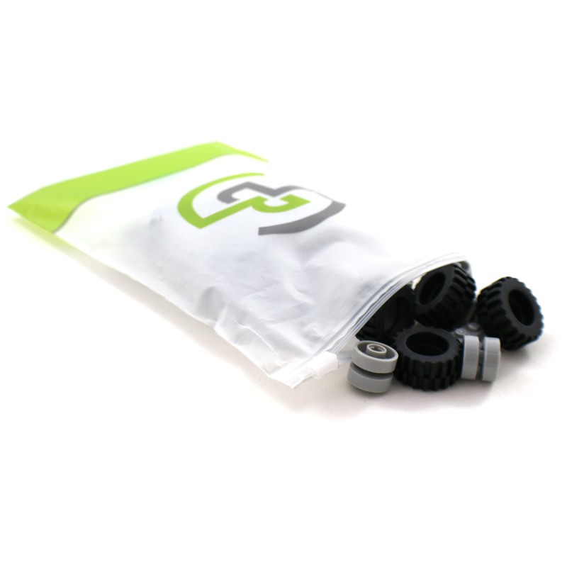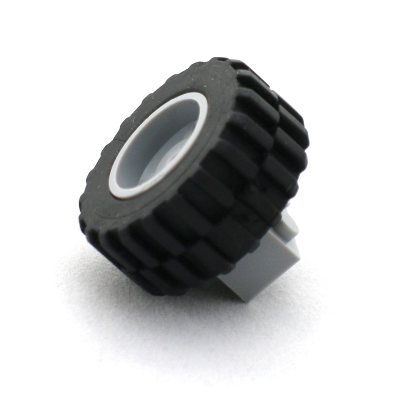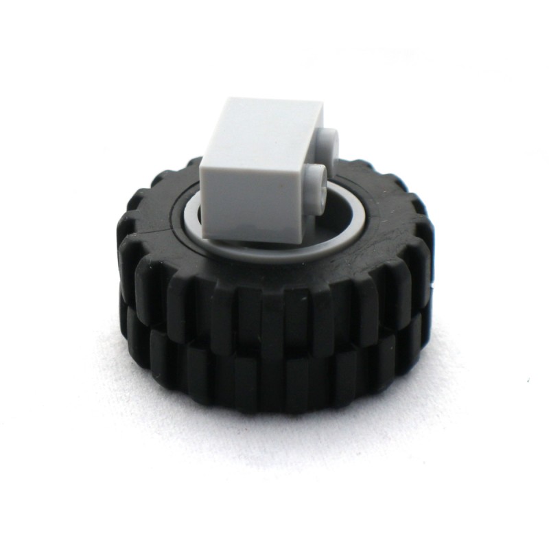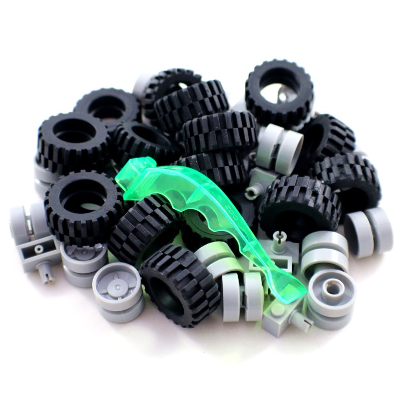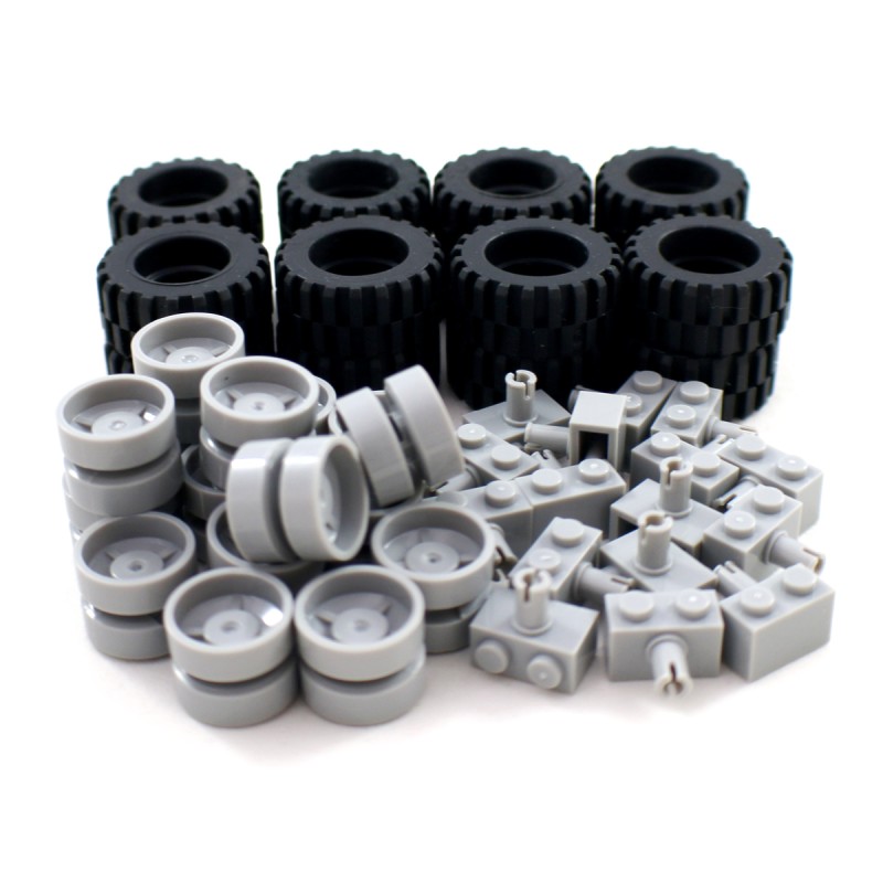 This set of vehicle accessories consists of 16 rubber tires, 16 wheel hubs and 16 axles. These wheels are large size and are suitable for trucks and buses (at a building block figure scale).